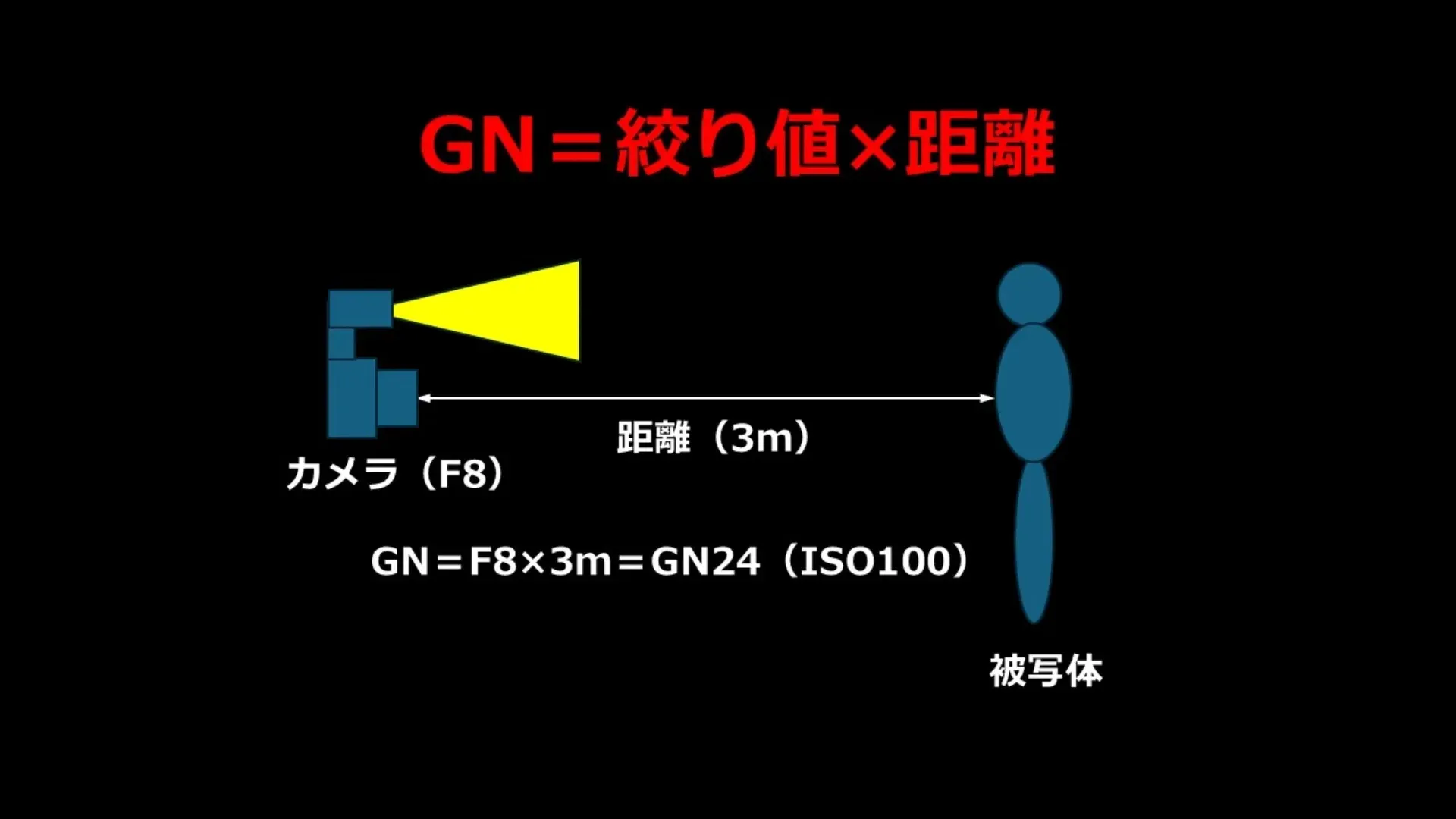 式:ガイドナンバー(GN)=距離(m)×絞り値(F値)