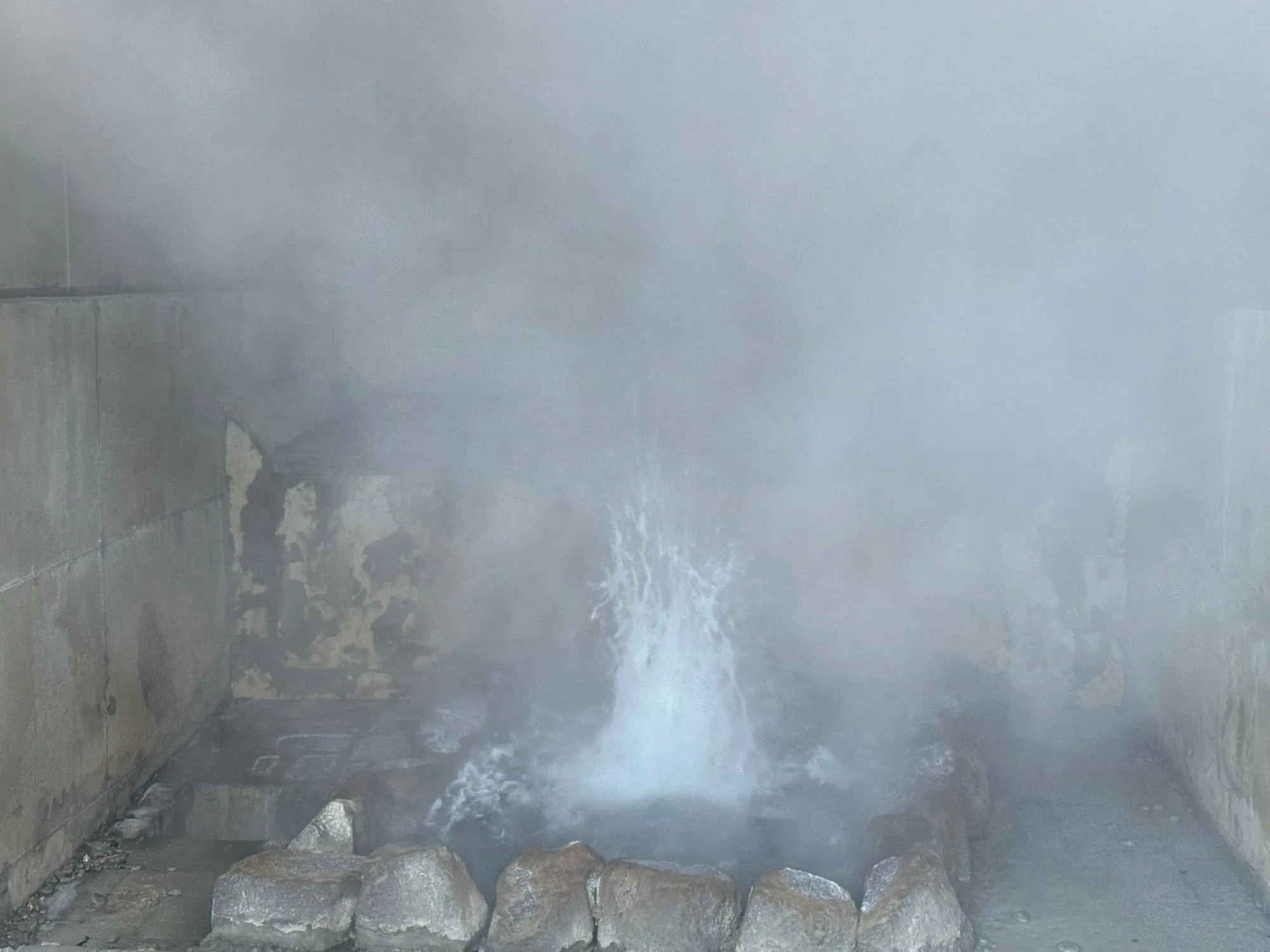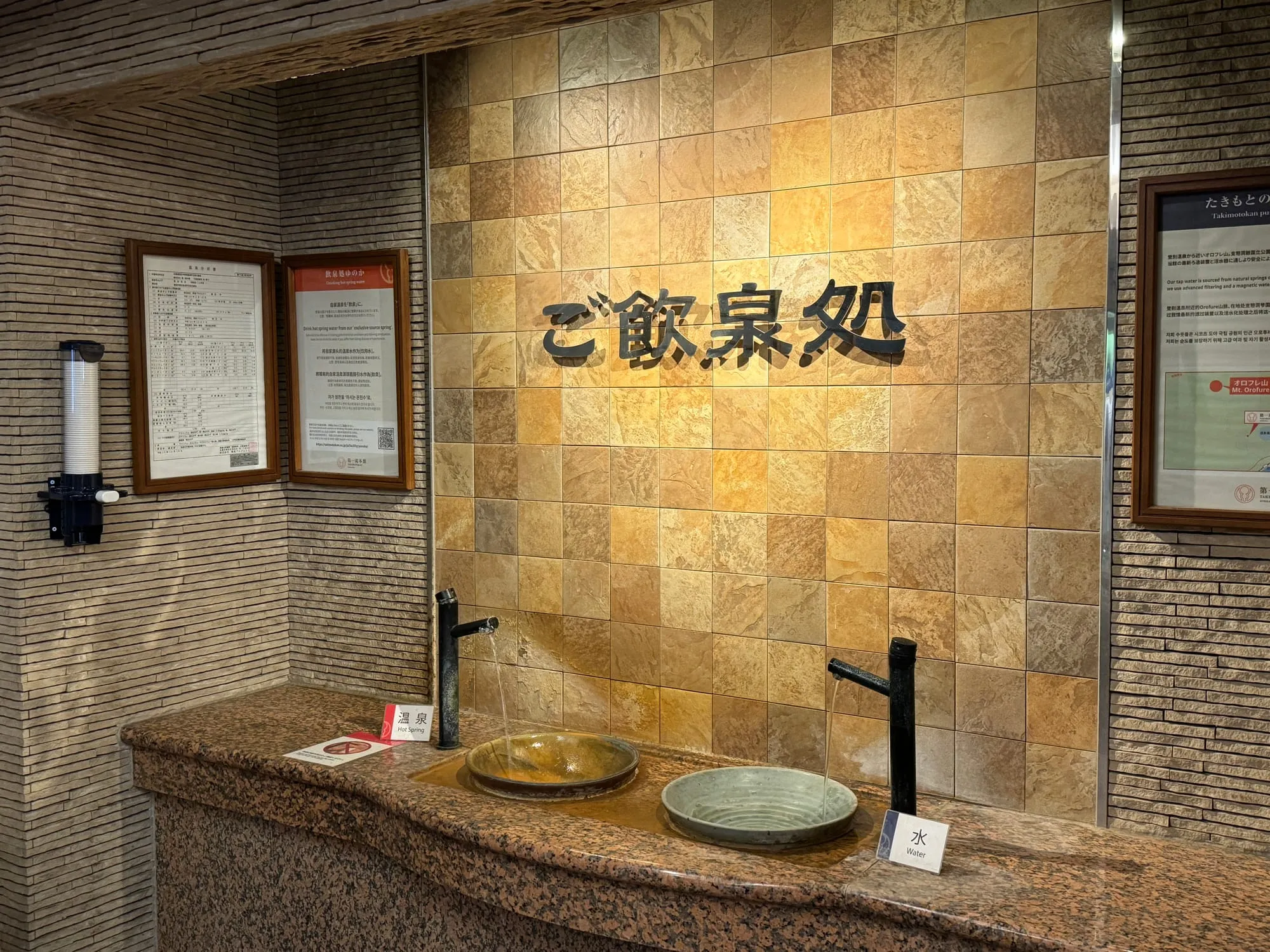 在大浴场里,5种不同泉质的温泉水各有其妙。这里采用"放流式"——温泉水直接从源头流入,不循环使用,也不加热加水。温泉水源源不断地流出,略带硫磺味道,仿佛能感受到地球的脉搏。
