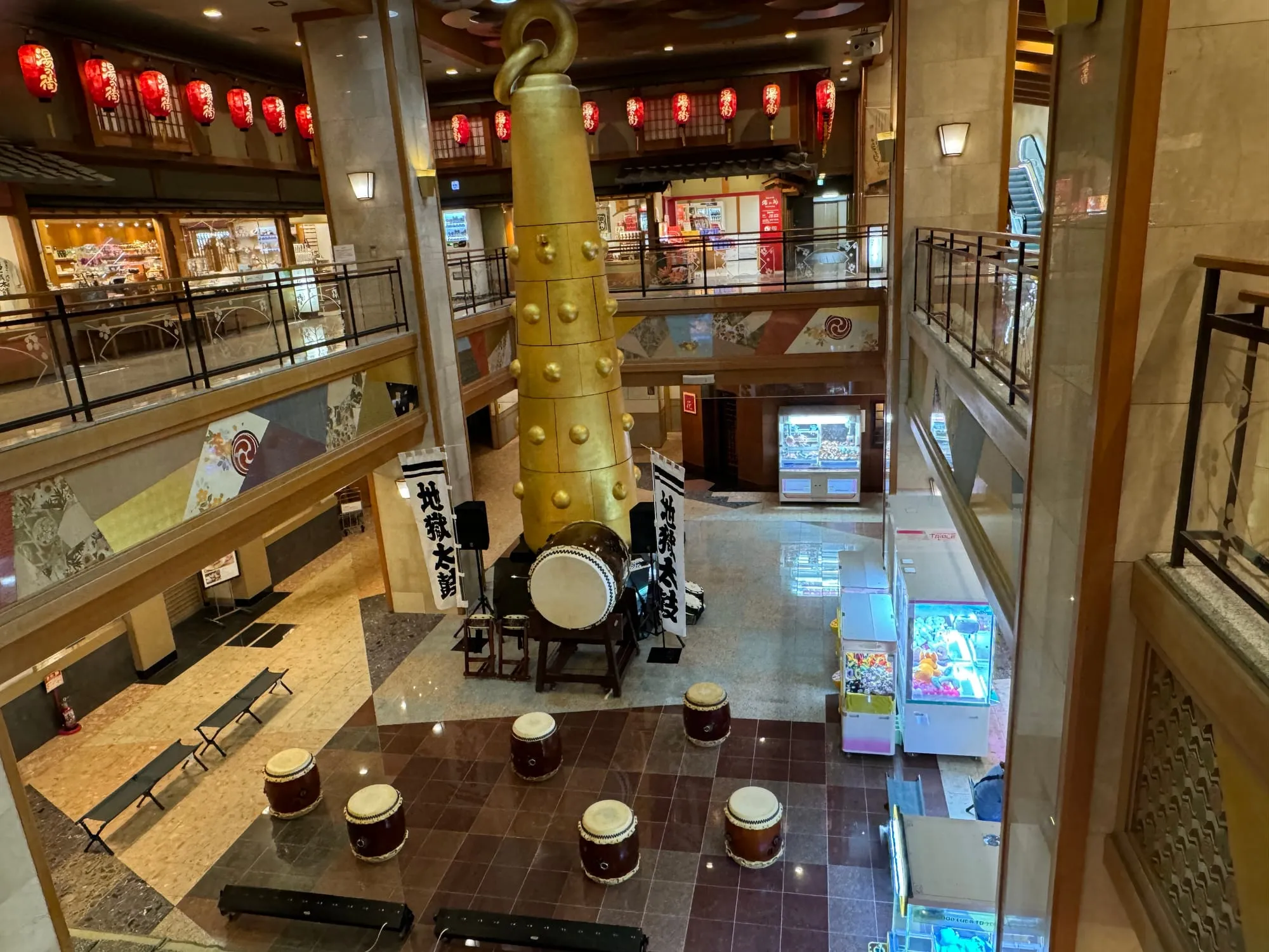 在第一滝本馆的大厅里,放置着一根高九米、重达十吨的镀金大金棒,赫然入目气势非凡。这家创立于1858年的老字号温泉旅馆,背后有着一段动人的故事。