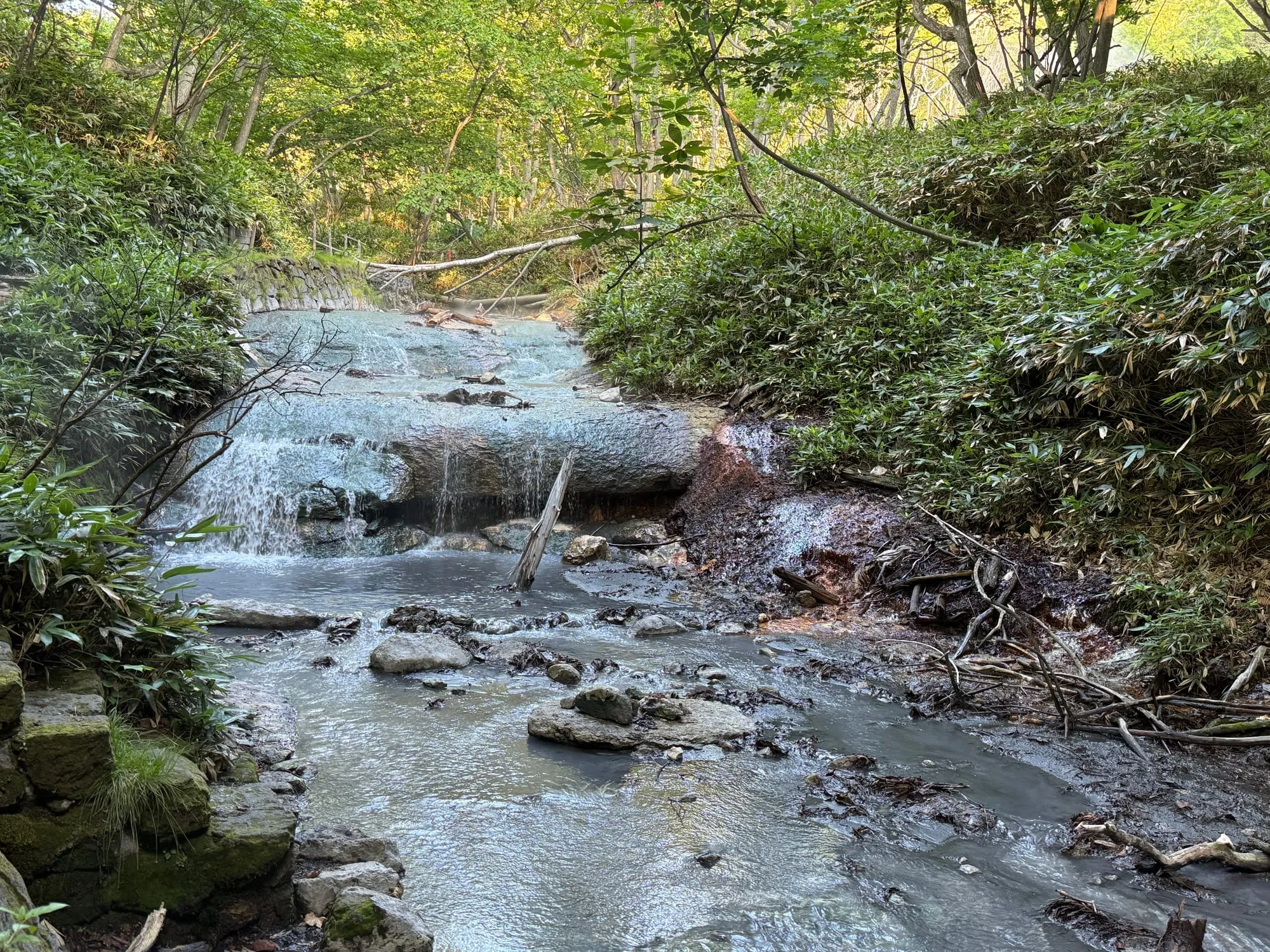 在前往大汤沼的路上,我发现了一处天然足汤。沿着大汤沼河的步道走到尽头,约5分钟就能找到。这里的水温不太稳定,通常在35度左右,偶尔会升到50度。