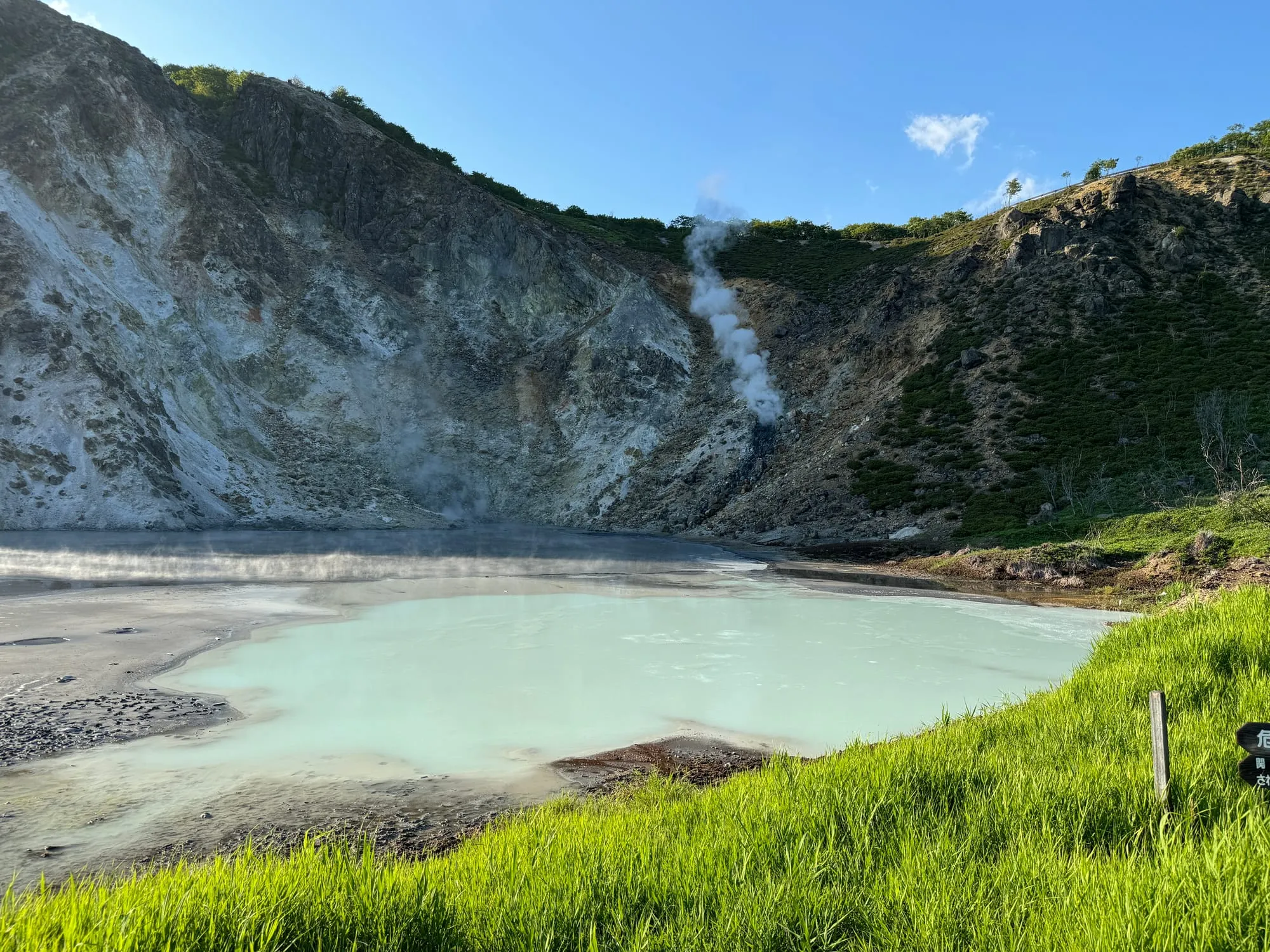 清晨,我沿着步道走向地狱谷。沿途的解说牌详细介绍着地质的成因。地狱在中国文化中是阴森恐怖的;但在这里,是人们对温泉源头敬畏的称呼,是孕育温泉的圣地。地狱谷是直径约450米的火山口,每天涌出一万吨以上的沸腾的热泉。站在观景台上,热泉的蒸汽从地缝中袅袅升起,空气中弥漫着硫磺的气味。