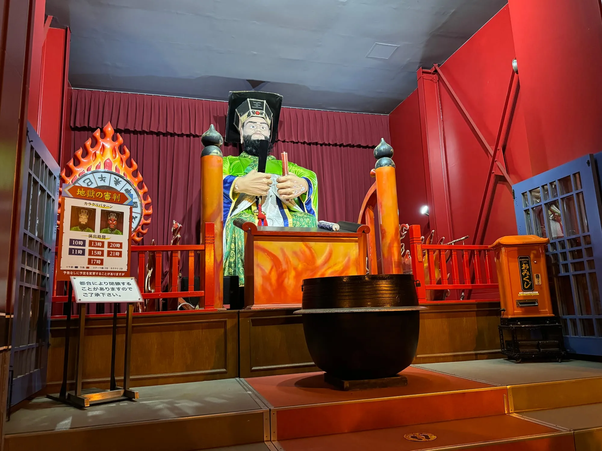 最精彩的要数极乐通商店街的阎罗王堂。每天六场的地狱审判表演,阎罗王从慈眉善目到怒目圆睁的瞬间变脸,配合声光效果,让人仿佛真的置身地府。有趣的是,游客们会将心愿写在纸上,连同香火钱一起投入阎罗王前的大碗中,祈求愿望成真。在这里,鬼是现代与传统、恐怖与祈福的奇妙融合。