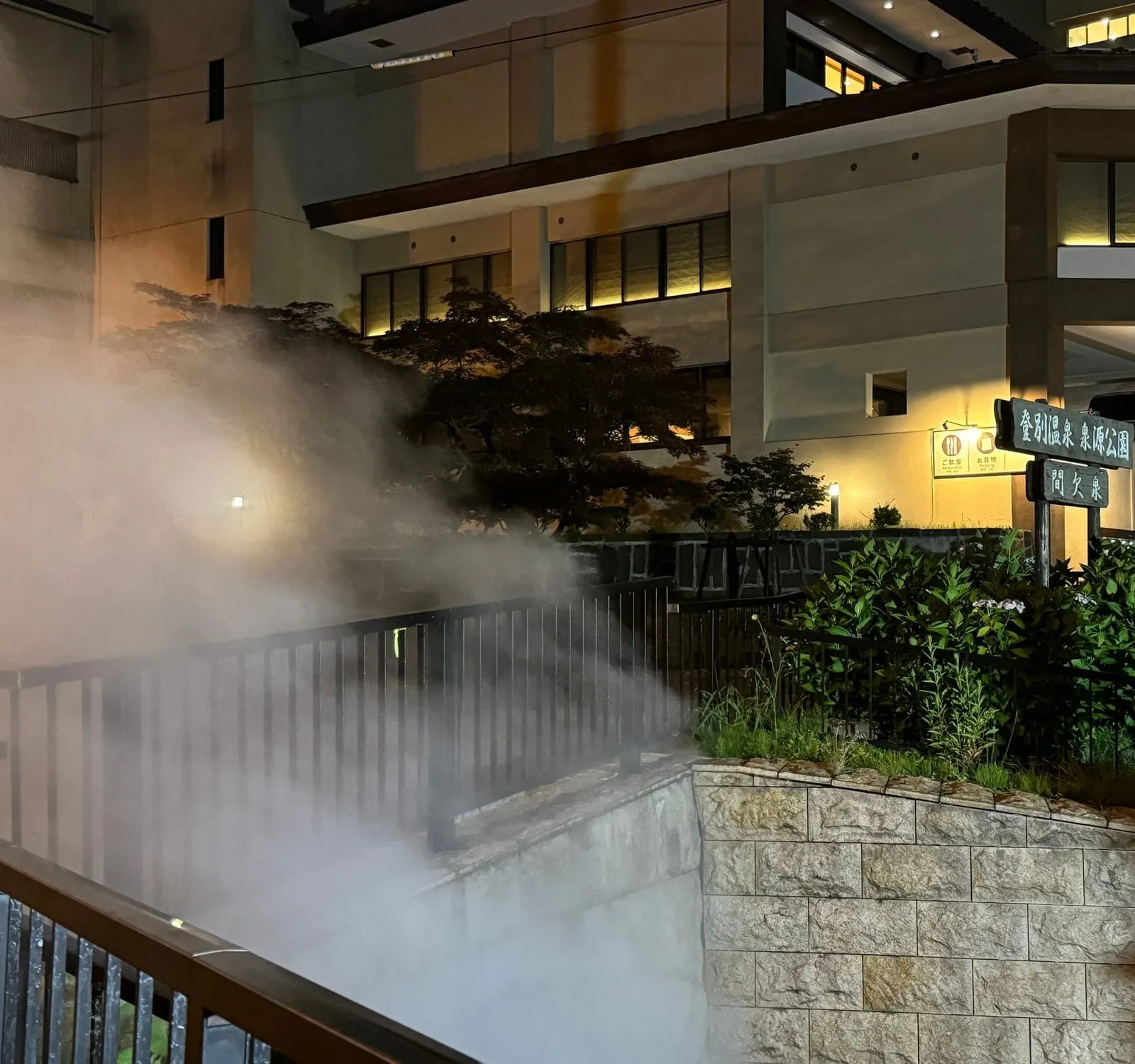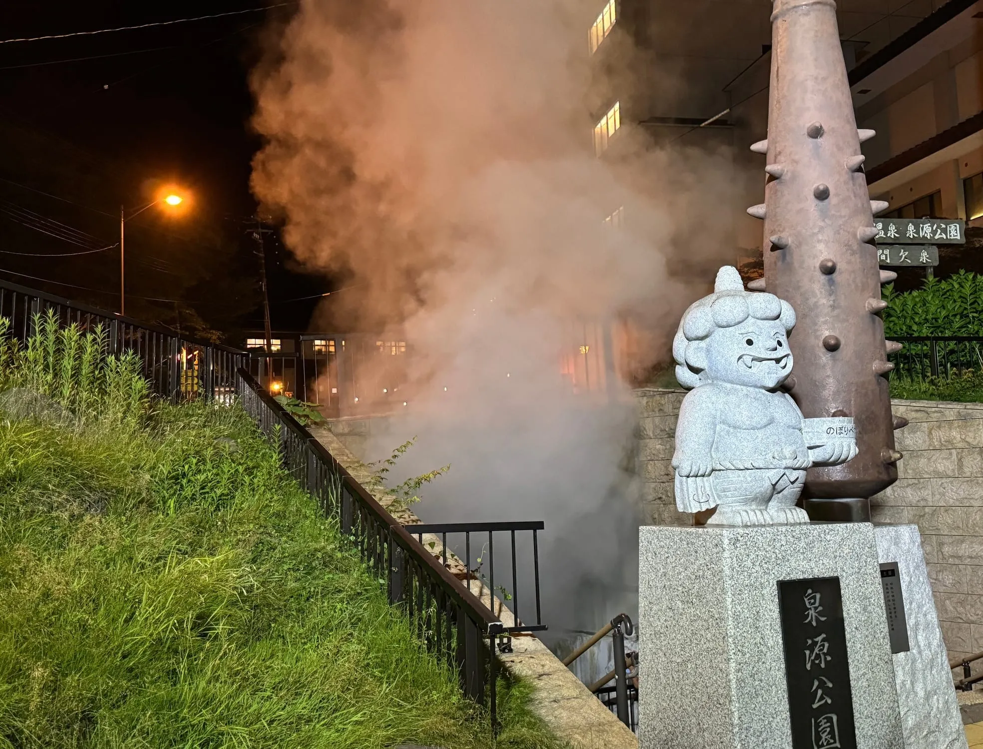 黄昏时分,我来到第一滝本馆前的泉源公园。这里是为纪念登别温泉开汤150周年而建。公园内的间歇泉每隔三四小时喷发一次,伴随着轰隆巨响,水柱冲天而起,气势磅礴。