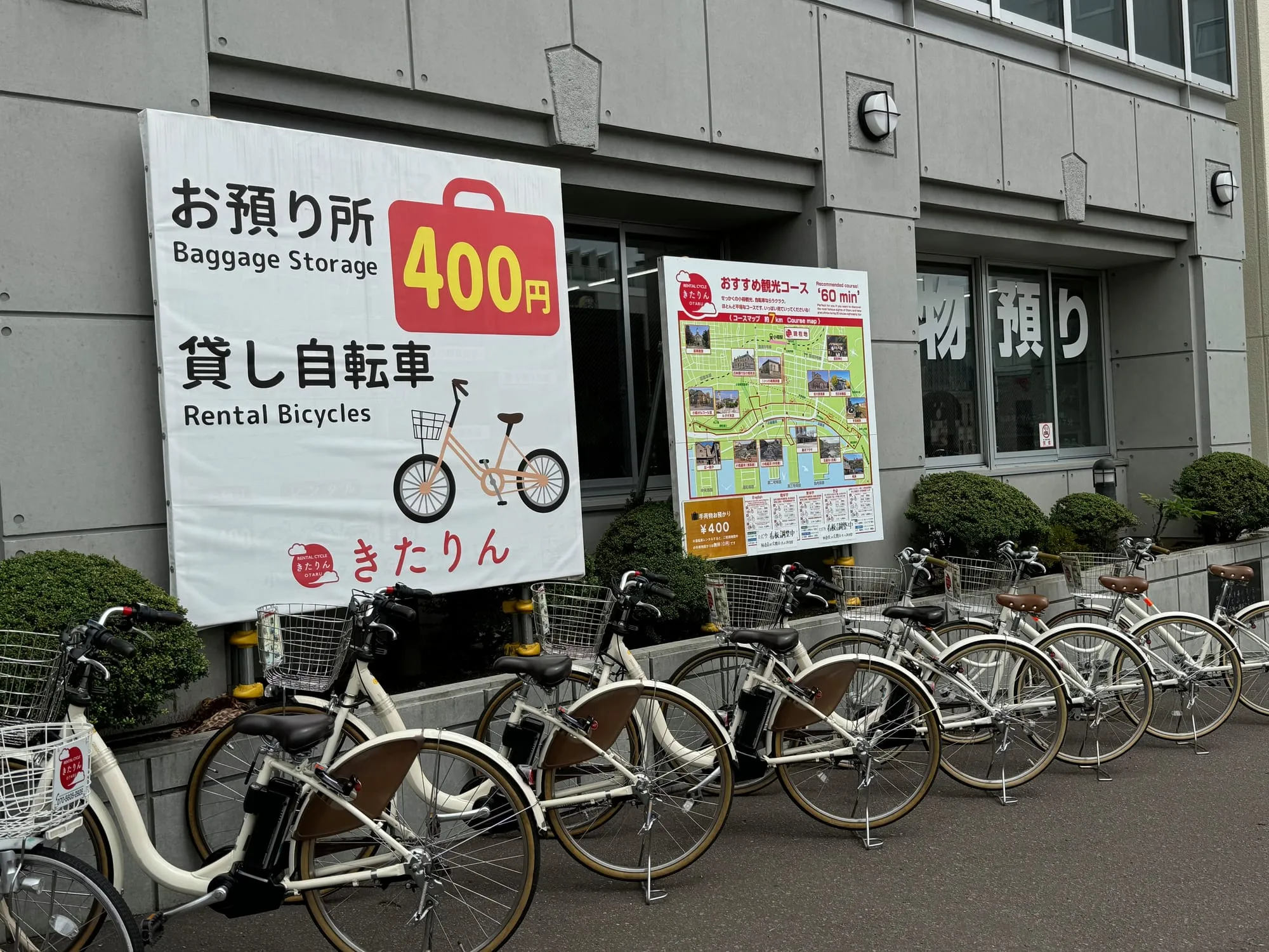如果你像我一样是个喜欢深度体验的旅行者,不妨考虑在KITARINN租一辆电动脚踏车。小樽的坡道不少,电动车会让你的探索之旅轻松很多。我来到站前叫KITARINN自行车租赁(这里还提供行李寄存服务),我们租到一辆电动自行车。老板娘是个热情的人,她用简单的中文跟我们打招呼。
