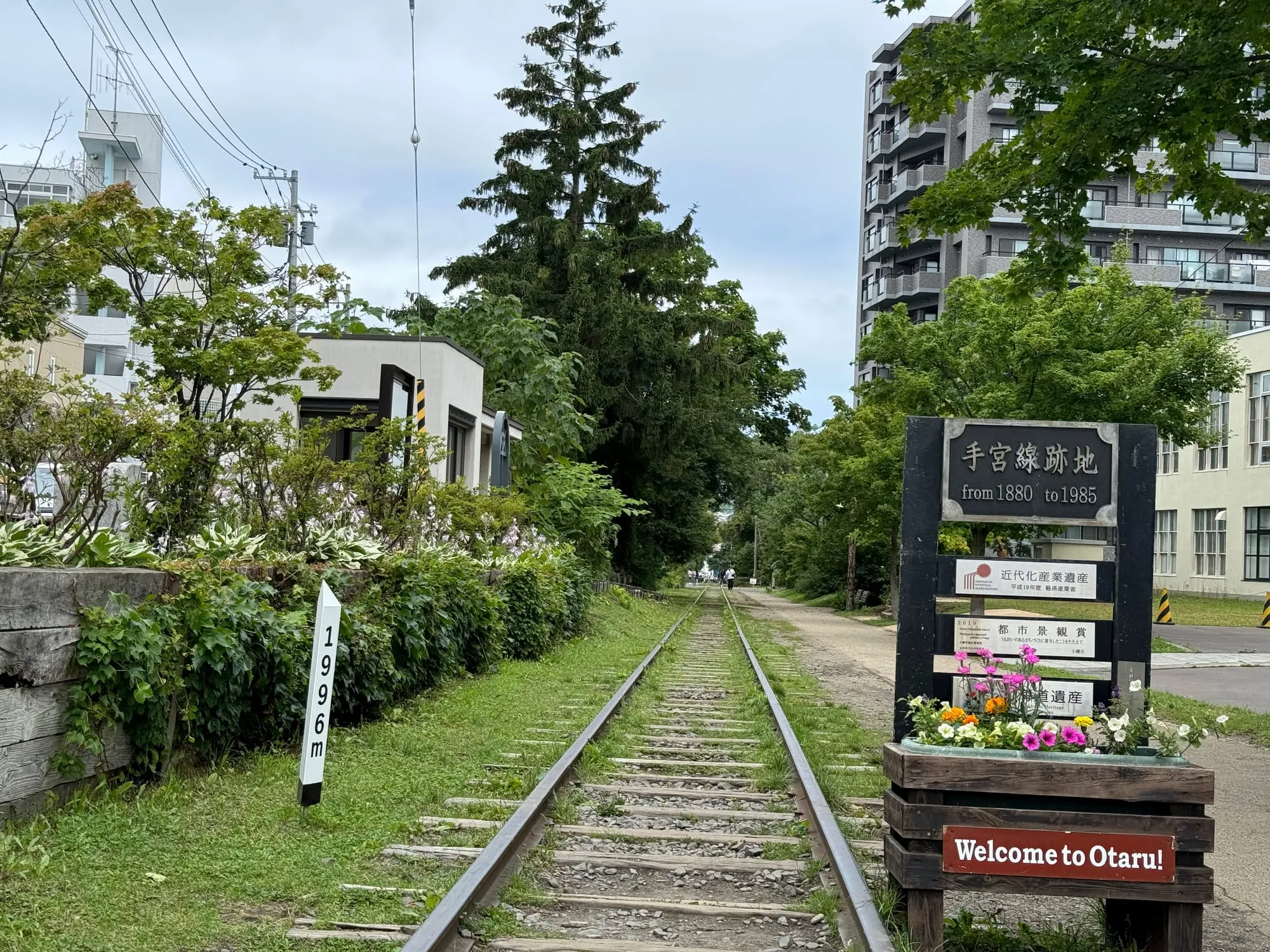 如果说运河代表了小樽的水运历史,那么手宫线铁路遗址就见证了这里的陆路交通发展。这条北海道最早的铁道线路,于1880年开通,主要用来运送北海道优质的煤炭和海产品到日本全国各地。历史的车轮滚滚向前,随着汽车时代的到来,1962年手宫线停止运营,1985年正式废止。2016年,手宫线铁路遗址被改建成了一条长1996米的步行道,从市中心一直延伸到小樽市综合博物馆。我沿着铁轨慢慢前行,想象着八十多年前蒸汽机车呼啸而过的场景,思绪万千……